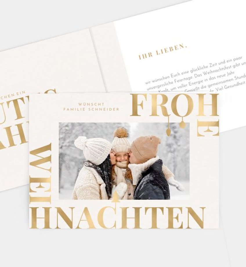 Wenn Sie Ihren Geschäftspartnern zum Jahresende eine persönliche Grußbotschaft zukommen lassen möchten, dann gestalten Sie geschäftliche Weihnachtskarten bei Kartenliebe. Passende Textvorlagen finden Sie auf unserer Sprücheseite für geschäftliche Weihnachtsgrüße.